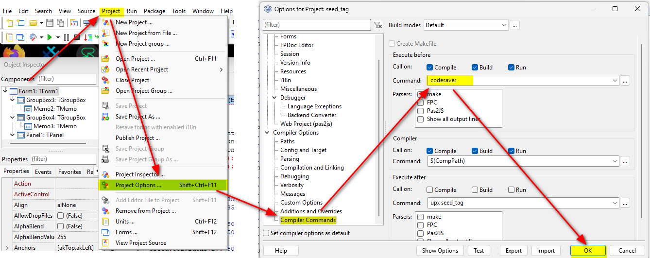 Open ini file, set your own password (only version with TAbZipper), add your source code files into section "[SaveFiles]", run "codesaver[.exe]" and use "src.inc" in your project (example in folder "Sample" )