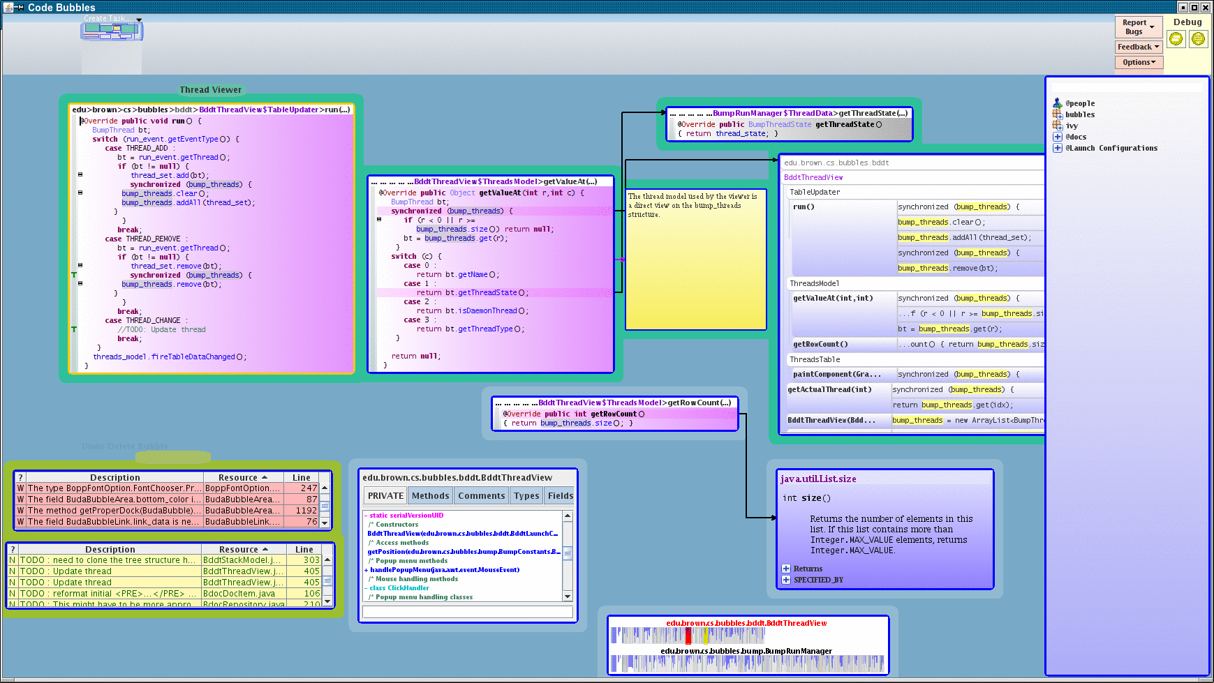 Code Bubbles is a front end to Eclipse designed to simplify programming by making it easy for the programmer to define and use working sets. It provides compact function-based views of the code (all backed by the underlying files) that are displayed in bubbles and that are easily moved around and manipulated on the screen. The bubbles are fully editable. A large bubble area lets the programmer set up different working sets simultaneously and easily move between them.