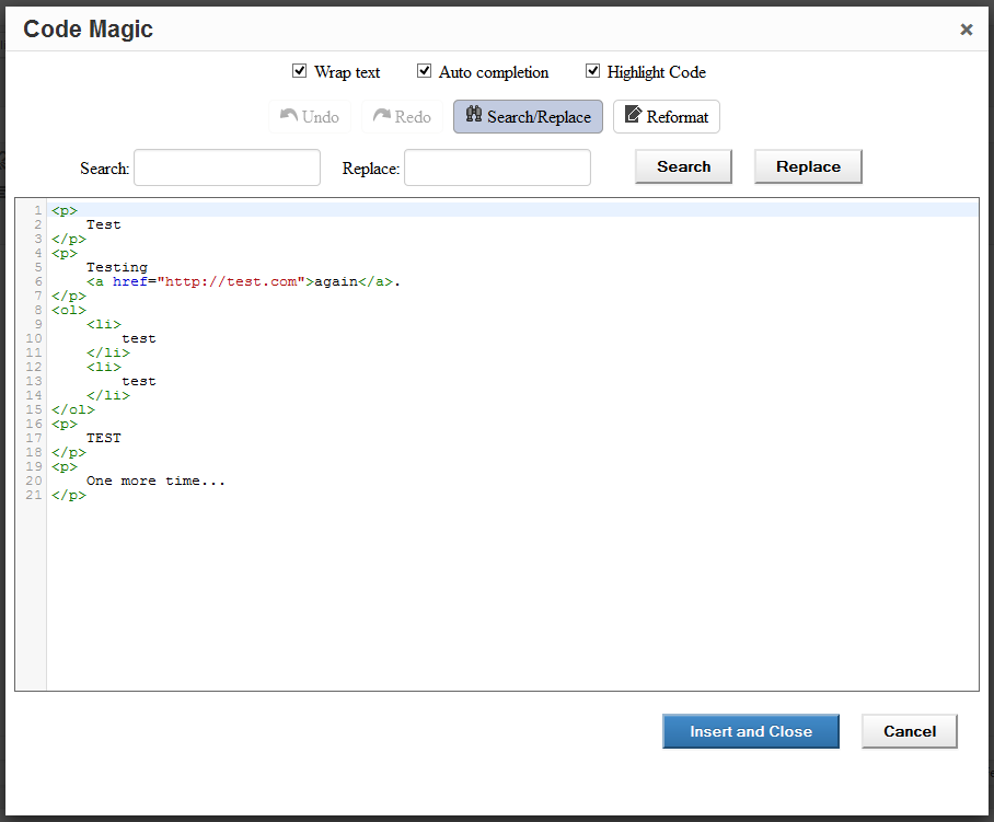 An advanced HTML editor with code formatting, code beautification, and auto-complete functionality.