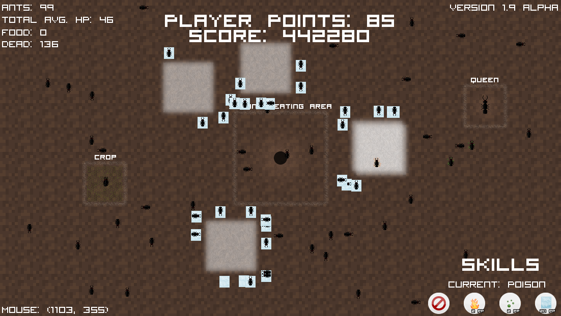 Colony is an opensource two-dimensional game developed in Python and Pygame as an educational learning experience by Jonathan Redeker. Ants spawn and live in their colony breeding, feeding, and hoping they will not die of disease. The user plays as a god destroying their colony with different skills depicted by their "player points". Colony is compiled with PyInstaller and the music and sound effects were created by lunarfox (http://www.facebook.com/lunarfox, http://soundcloud.com/lunarfox)