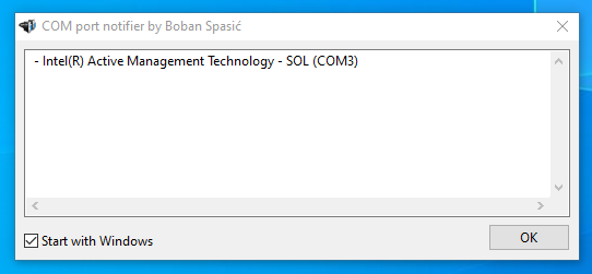 A notification with the list of COM ports will pop up at connecting a USB-to-Serial adapter. The tool can be set up to start with Windows.