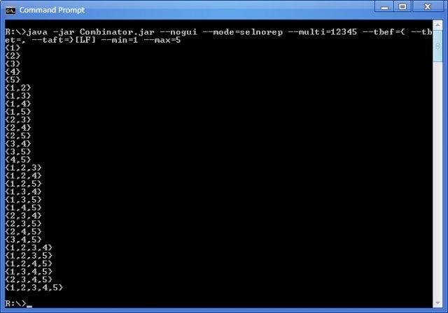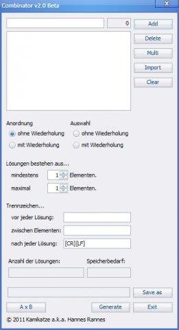 A program to calculate and create lists of possible variations (permutations) and selections (combinations) of a given set of elements. Creating the cartesian product of two sets is also possible.