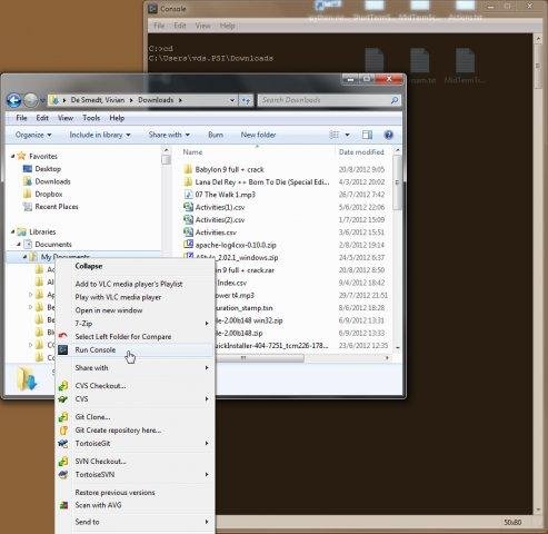 This is a development branch of Console by bozho (http://sourceforge.net/projects/console/). It adds: explorer context menu support, reactivation of existing tabs and more.