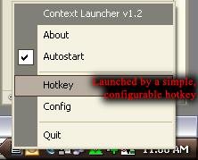 [NOTE]Requires .NET FRAMEWORK 2.0 NOW Context Launcher is a small application written in C#. It is a simple program launcher that allows you to categorize shortcuts to any number of applications and launch them from a special context menu that is brought