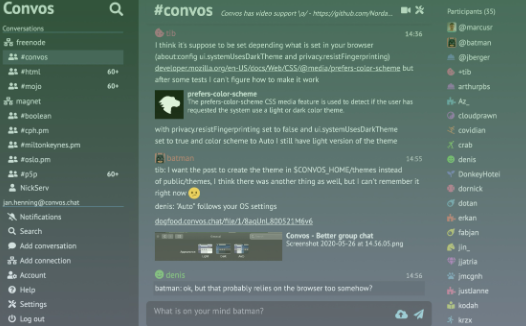 Convos is a persistent, multiuser, browser-based IRC client built using Mojolicious (backend) and Svelte (frontend). It keeps users continuously connected (even when browsers are closed), supports video chat, theming, inline media, and allows self-hosting on personal servers, cloud, or Docker. The supported chat protocol is currently IRC, but Convos can be extended to support other protocols as well. Backend powered by Mojolicious, frontend using Svelte framework. Built-in video chat support for one-on-one or group conversations. Persistent IRC connection and message history even when browsers disconnect (“always online”).