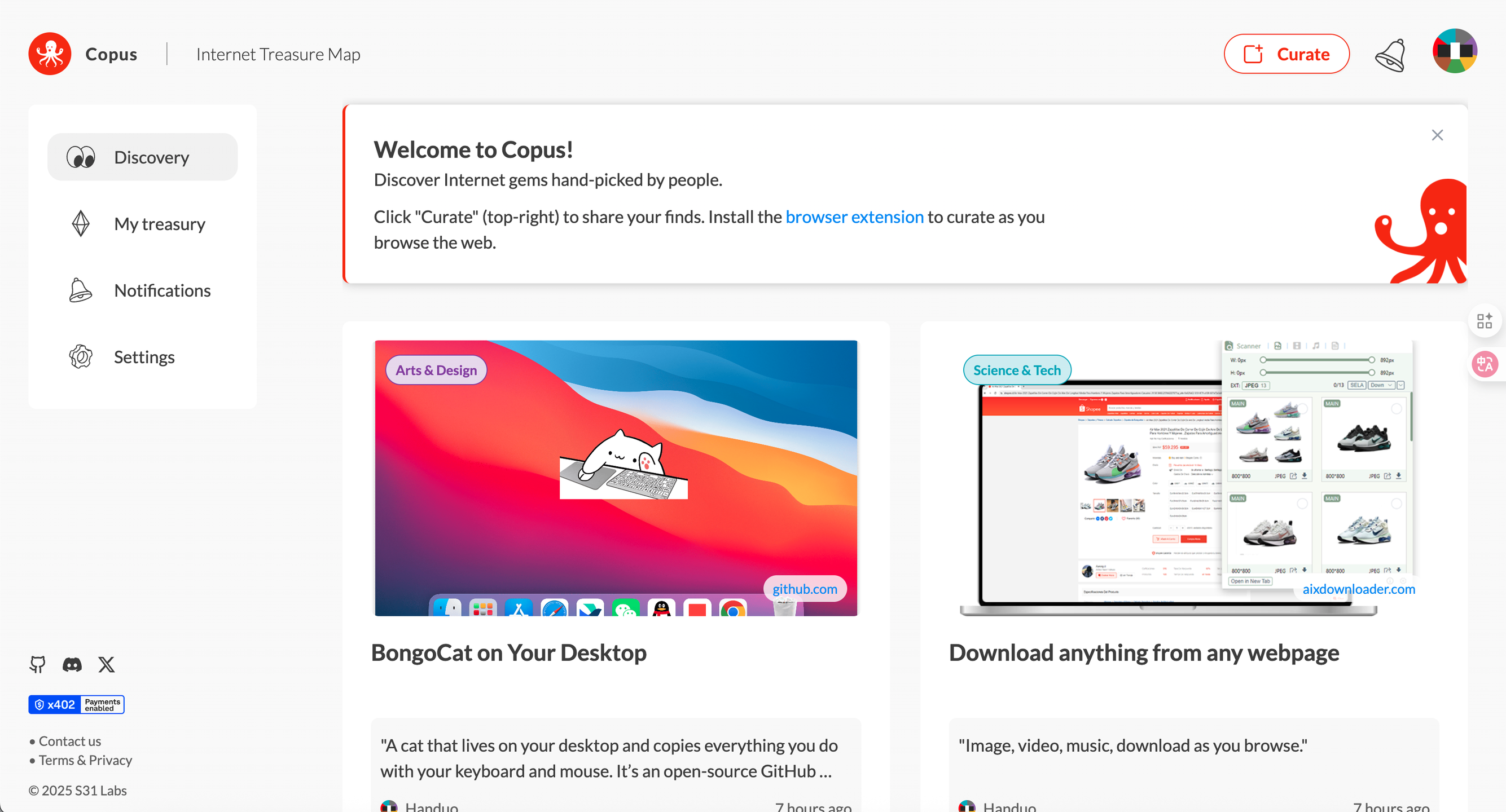 Built on the x402 protocol, Copus creates an incentive system for information collection by humans and AI agents, along with a matching marketplace product. When users (or AIs) access web data, both curators and original creators earn: curators receive active income, and creators receive passive income. This drives the viral growth of the x402 ecosystem.