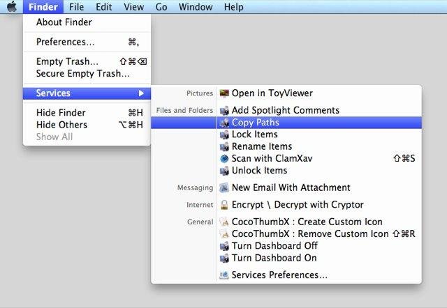 This service will be available in Finder's Services menu and contextual menu if files and/or folders are selected. It enables you to copy the POSIX path of one or more Finder items to the clipboard.
