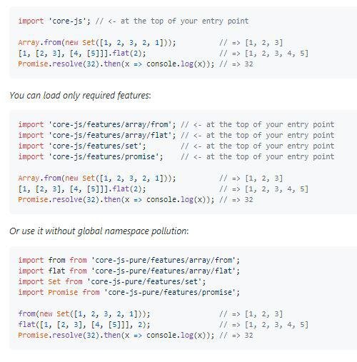 - core-js is integrated with babel and is the base for polyfilling-related babel features