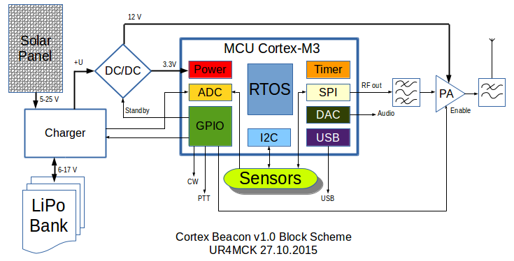 - Dynamical CW code from remote sensors (temperature, humidity, power supply, etc.) as well as static text (callsign, QTH, power)