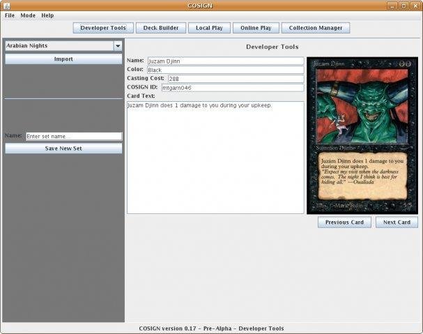 The Collectible Card Game (CCG) Open Source Internet Gaming Network (COSIGN) allows for CCG development and game play through its open interface. Users may play existing games or develop new games in a friendly Java-based graphical user interface.