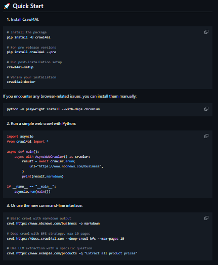 Crawl4AI is a high-performance, AI‑ready web crawler tailored for LLM data ingestion and RAG pipelines. It supports adaptive crawling heuristics (stopping when enough info is gathered), structured markdown output, and high-speed parallel execution. Designed to operate at scale with optional Docker deployment and framework integrations.