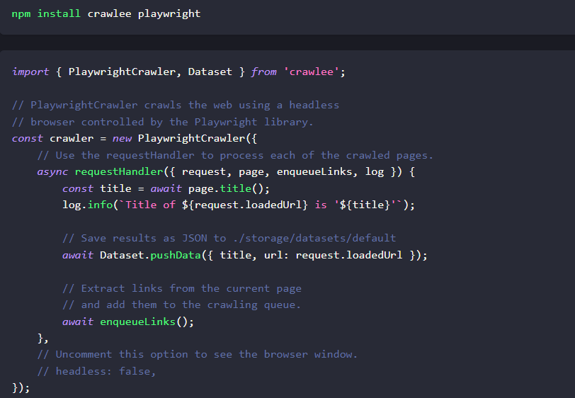 Crawlee is a web scraping and browser automation library. It helps you build reliable crawlers. Fast. Crawlee won't fix broken selectors for you (yet), but it helps you build and maintain your crawlers faster. When a website adds JavaScript rendering, you don't have to rewrite everything, only switch to one of the browser crawlers. When you later find a great API to speed up your crawls, flip the switch back. It keeps your proxies healthy by rotating them smartly with good fingerprints that make your crawlers look human-like. It's not unblockable, but it will save you money in the long run. Crawlee is built by people who scrape for a living and use it every day to scrape millions of pages. Meet our community on Discord. We believe websites are best scraped in the language they're written in. Crawlee runs on Node.js and it's built in TypeScript to improve code completion in your IDE, even if you don't use TypeScript yourself.
