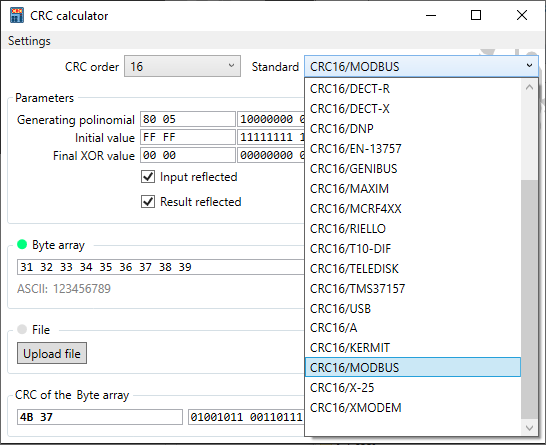 Application for calculating CRC checksum such as CRC-8, CRC-16, CRC-32 and CRC-64 with most popular parameters. The application needs .NET 4.6.