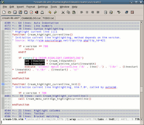Cream is a free, easy-to-use configuration of the famous Vim text editor for Microsoft Windows, GNU/Linux, and FreeBSD. It uses common menus, standard keyboard shortcuts, and has extensive editing functions for the beginner and expert alike.