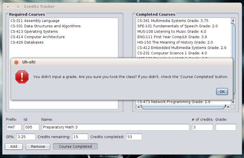 Credits Tracker is an application that allows users to track how many credits they have completed, how many they have left, and their GPA