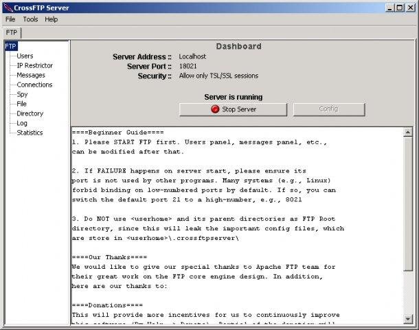 CrossFTP Server is a secure enabled FTP Server for multiple platforms. It offers a high-performance, easy configurable, and most of all a secure FTP server. It is very easy to start a new FTP service for the novice users, and for advanced users as well.