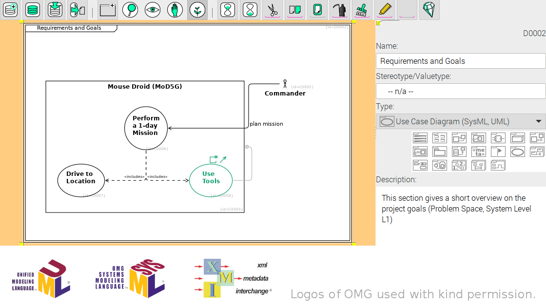 Good: Create many UML+SysML Diagrams which are based on the same meta model (consistency) Good: Export to various formats: docbook, xhtml, png, svg, ...