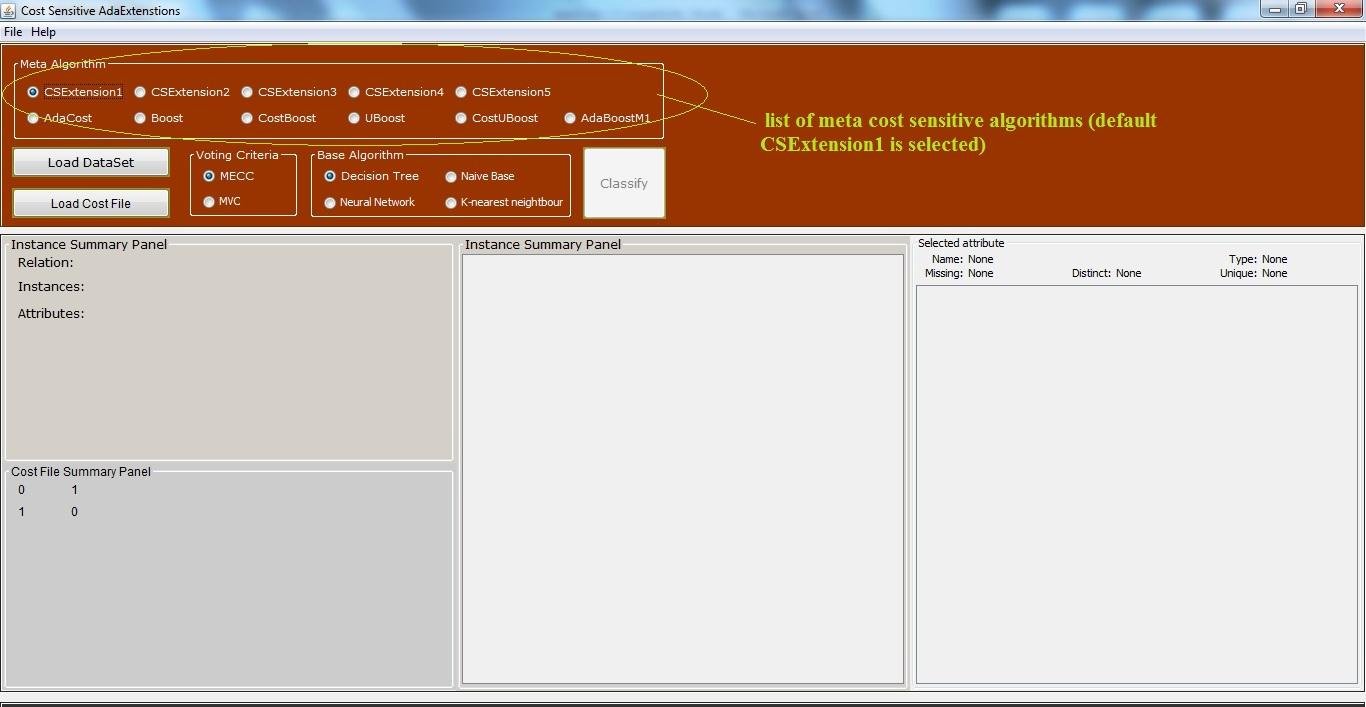 Input also requires to load an arff file and a cost matrix (sample arff and cost files are uploaded for users' reference)