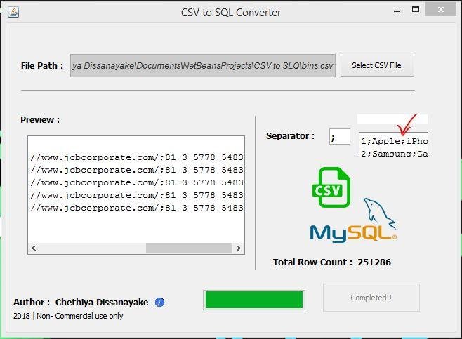 This tool will help you to convert your CSV files to SQL files with easy steps. Free to use. Requires Java to run.