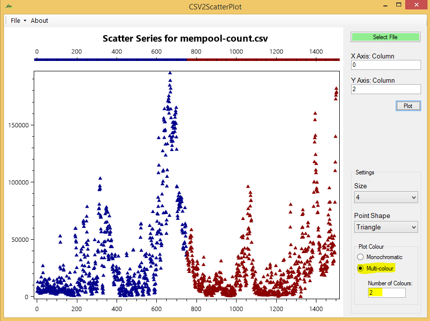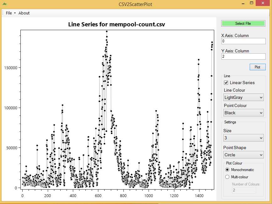 Do you have CSV full of data but hard to find a pattern just from the numbers? CSV2ScatterPlot help you to discover patterns from these columns of numbers by representing them as Scatter Series. Simply select the X axis and Y axis columns from the CSV and get a visual representation instantly. You can also use the same software to plot in Line Series instead as well.