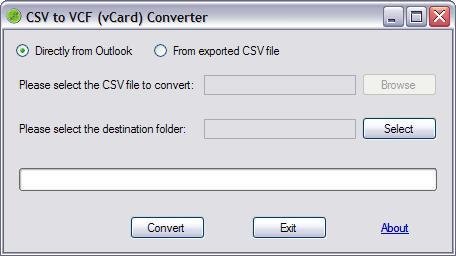 CSV2VCF is a small utility that will help you convert Microsoft Outlook contact entries into vCard files. You can choose to either convert directly from Outlook, or you can convert already exported CSV files.