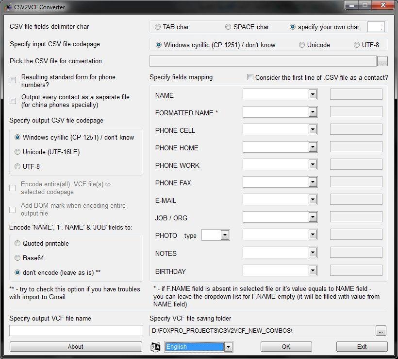 This software will help you to convert a .csv(Comma-Separated Values) files to .vcf(vCard 2.1) files. For example, you'll find it very helpful for transfering your contacts from old-types cell phones, wich can export it's phonebook to csv only, to newer ones or even smartphones, etc.