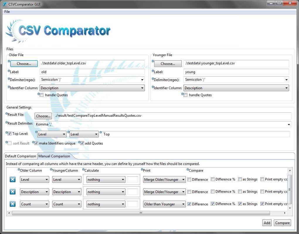 CSV Comparator is a tool for comparing files which contain CSV-Data. It was created for performance engineers to be able to have a easy way to compare data from two testruns and be able to automate the comparing process of various files with scripts.