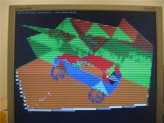 - it's the seme program as XCTruck3D _Truck but it display the 'pixels' throught a text terminal, inserting a matrix of coloured characters, throught the fast and non-vibrating text-display functionality offered by any Linux/UNIX terminal throught the Curses Library.