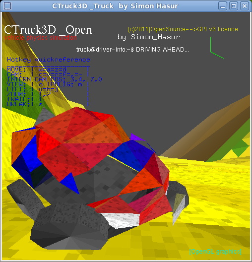 It's a 3D, physically realistic truck/car simulator, oriented to dirt tracks. This is subsancially kept as hystorical. The environment is a hilly terrain which can also be user-defined in the form of a Bitmap image file (where intensity of red component defines height). It's similar to the classic "Terep 2". Particular care for internal cam. Written in standard C. There's a Windows executable ready for use, but it's compilable and playable on all Linux, BSD, MacOSX systems. Official VIDEO presentation: http://www.youtube.com/watch?v=B74QvPGyBYM