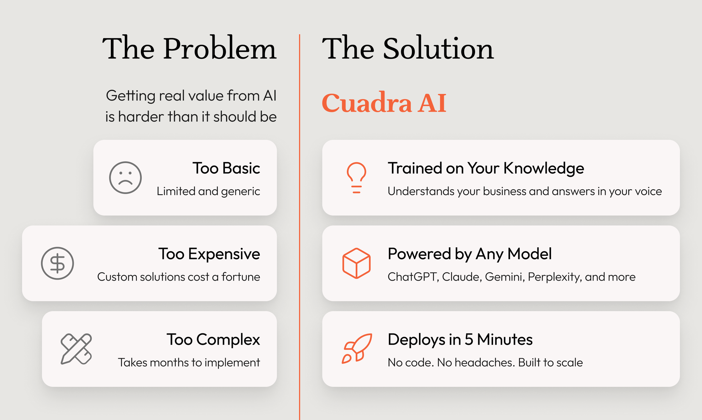 Cuadra AI lets you build your own AI. One that continuously learns from your business, runs on any model, and works wherever your users are.