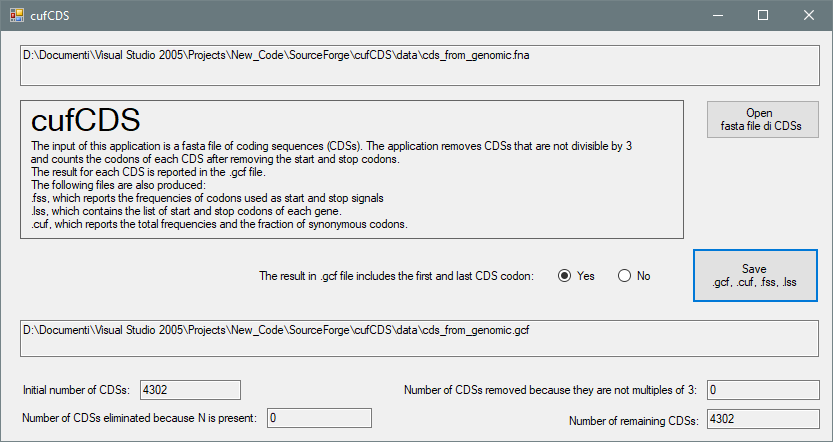 The input of this application is a fasta file of coding sequences. The application removes CDSs that are not divisible by 3 and counts the codons of each CDS after removing the start and stop codons. The result for each CDS is reported in the .gcf file.