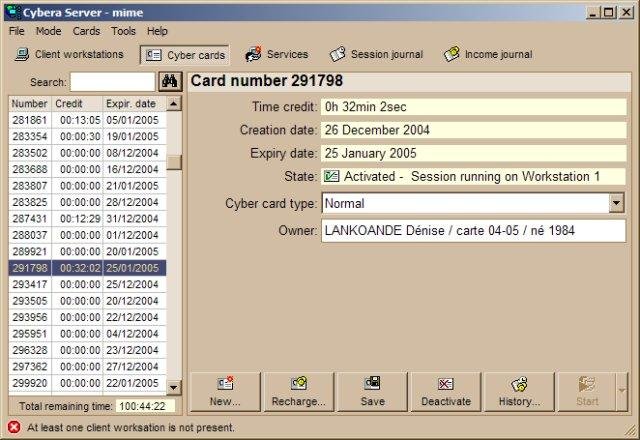 Cybera is an Internet cafe administration system. It works with prepaid cards or client accounts or in a post paid Self Service mode. Features include workstation control, user rights lockdown, accounting, stats and screen replication for CAI.