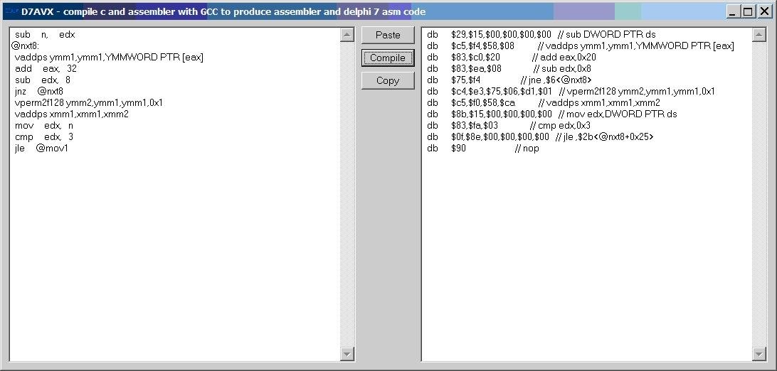 - helps using SSE/AVX instructions with Delphi compilers not supporting SSE/AVX instructions