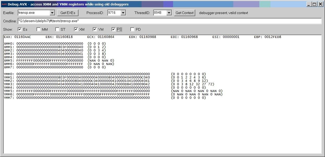- helps debug programs using SSE/AVX instructions with Delphi compilers/debuggers not supporting XMM/YMM registers