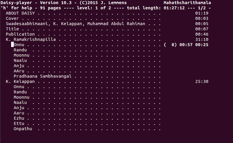 This an Open Source Daisy file player for linux environment developed by Jos Limmens. It support daisy files of format 2 and 3. The project currently run as TUI( Terminal User Interface) using ncurses library in C, plan to make it GUI using GTK+ 3. So seek development support of developers who love to take part of this open source venture.