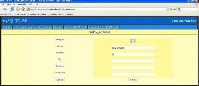 MySQL2JSP is an easy to use, quick & template driven JSP code generator that creates a full set of JSPs /servlets as well as JavaBeans from MySQL database using JDBC. Using the generated JSPs, developers can perform any operation on any database record.