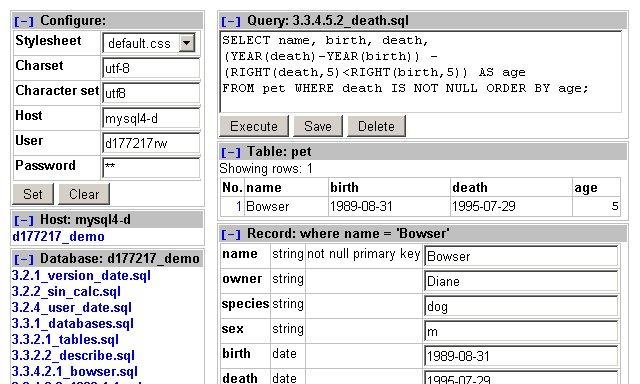 Simple MySQL frond-end like phpMyAdmin. Quick response and light weight(about 3KB). If you like, use this with phpMyAdmin. Demo server ready. Please try this.