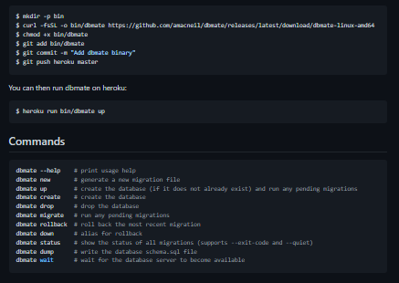 Dbmate is a database migration tool, to keep your database schema in sync across multiple developers and your production servers. It is a standalone command line tool, which can be used with Go, Node.js, Python, Ruby, PHP, or any other language or framework you are using to write database-backed applications. This is especially helpful if you are writing many services in different languages, and want to maintain some sanity with consistent development tools. Supports MySQL, PostgreSQL, SQLite, and ClickHouse. Uses plain SQL for writing schema migrations. Migrations are timestamp-versioned, to avoid version number conflicts with multiple developers. Migrations are run atomically inside a transaction. Supports creating and dropping databases (handy in development/test). Supports saving a schema.sql file to easily diff schema changes in git. Database connection URL is defined using an environment variable (DATABASE_URL by default), or specified on the command line.