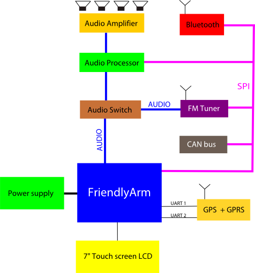 The aim of the project is to develop opensource multifunctional 7" touch screen computer for cars with following functions: