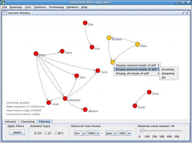 The Deep Email Miner Application is a software solution for the multistaged analysis of an Email Corpus. Social network analysis and text mining techniques are connected to enable an in depth view into the underlying information.