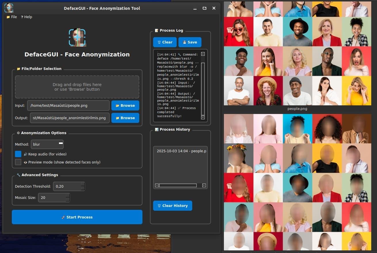 This application is a professional tool with a graphical user interface that enables anonymization of faces using the Deface Engine. Cross-Platform Compatible (Linux-Windows)