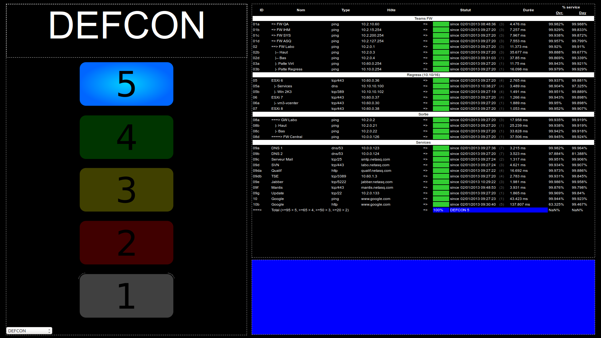 DEFConMon is a network monitoring tool allowing to display final service level on a "public" screen.