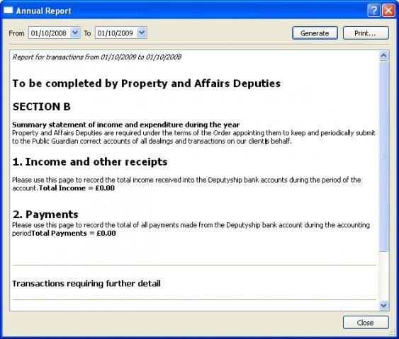 A money management program dedicated to generating annual reports for people appointed by the Court of Protection as deputies for financial affairs. Transactions may be imported from CSV files and allocated to COP reporting categories.