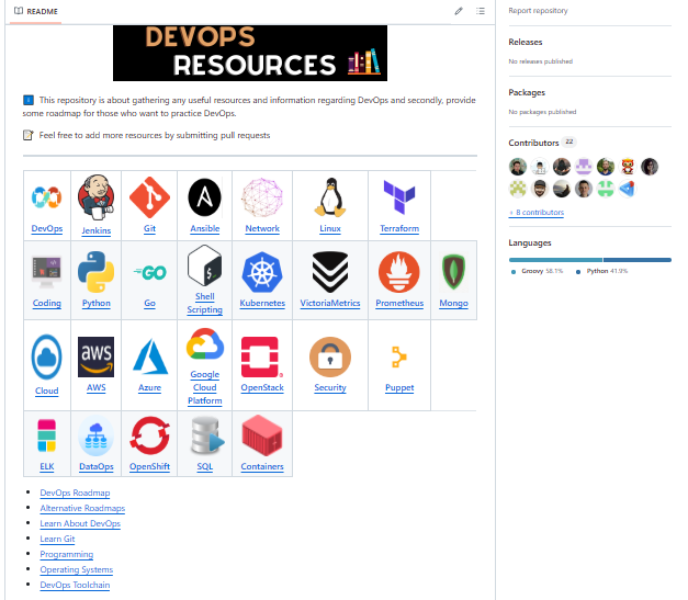 This repository aggregates useful resources, references, roadmaps, and learning materials in various areas of DevOps including Linux, Jenkins, AWS, SRE, Prometheus, Docker, Ansible, Git, Kubernetes, Terraform, OpenStack, SQL/NoSQL, Azure, GCP, and more. Curated tooling and technology references across multiple DevOps domains. Roadmaps and learning paths for building DevOps competence. It is meant as a guide for learners and practitioners to discover tools, concepts, and tutorials relevant to DevOps roles. Contribution instructions for community to add resources.