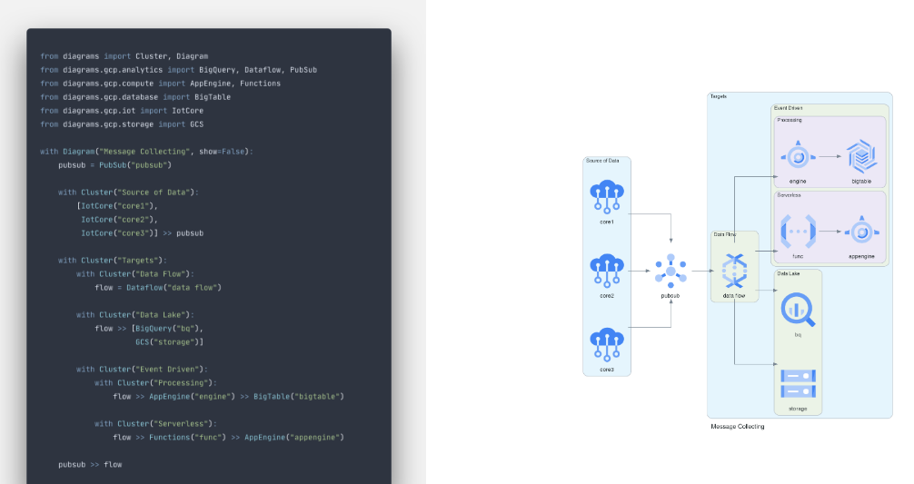 Diagrams lets you draw the cloud system architecture in Python code. It was born for prototyping a new system architecture without any design tools. You can also describe or visualize the existing system architecture as well. Diagram as Code allows you to track the architecture diagram changes in any version control system. Diagrams currently support main major providers including AWS, Azure, GCP, Kubernetes, Alibaba Cloud, Oracle Cloud, etc. It also supports On-Premise nodes, SaaS and major Programming frameworks and languages. It does not control any actual cloud resources nor does it generate cloud formation or terraform code. It is just for drawing the cloud system architecture diagrams.