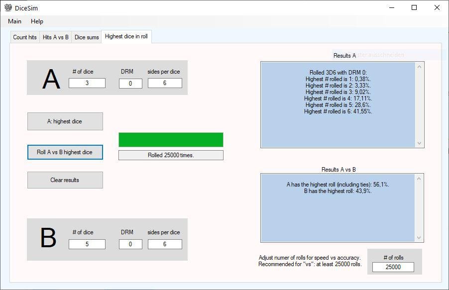 - Two competing sets of dices for highest number (e.g. "How likely is it that my 2D6 with +1 roll a higher highest number than 6D6?")"