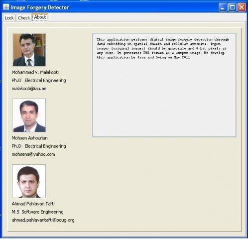 This application performs digital image forgery detection through data embedding in spatial domain and cellular automata. Input images should be grayscale at any size. It developed by Ahmad Pahlavan Tafti, Mohammad V. Malakooti and Mohsen Ashourian.