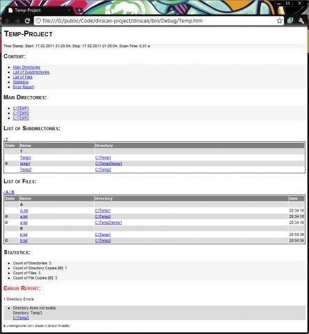 This small C# (mono or MS.NET 3.5 required) console program generates text or html output which lists directories and files. Copies of directory or file names will be marked in HTML output. I use it to find files in a messy company network.