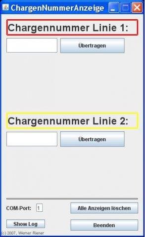 A Perl program to write characters (eg. a lot number) to an alphanumeric display via rs232. Includes Java Swing GUI. Developed for production in pharma industry. Currently two lines included. German version.