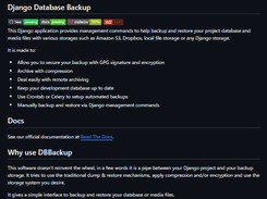 django-dbbackup is a Django management command extension for backing up and restoring databases and media files. It supports multiple storage backends including local file systems, Amazon S3, and Dropbox. Ideal for automated backup strategies, it simplifies the integration of backup logic into Django projects.
